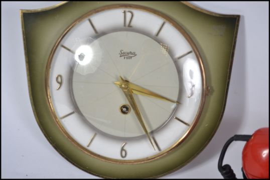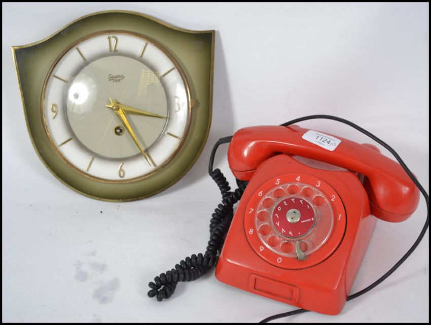 A retro 20th century red ring dial telephone together with a retro wall hanging clock.