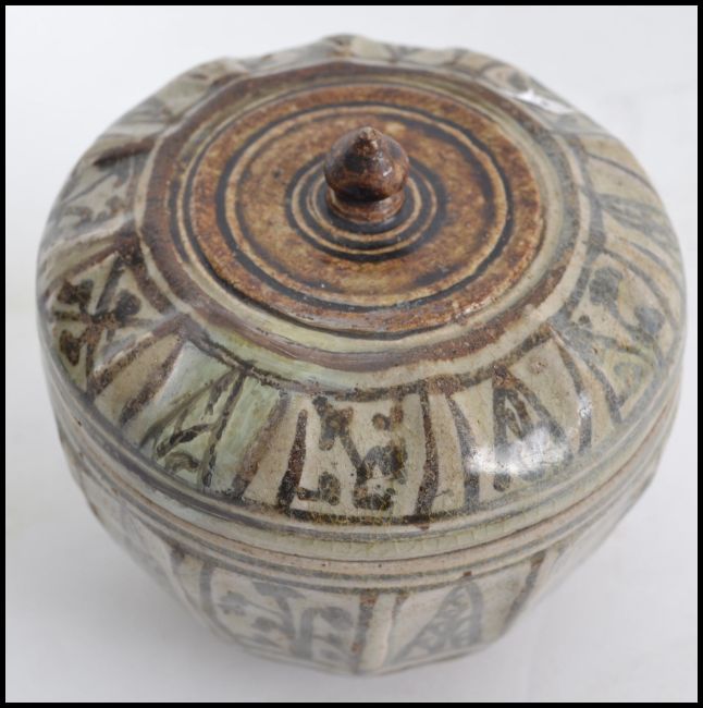 A believed 16th / 17th century Oriental stoneware lidded jar with finial atop. Measures 13cms wide.