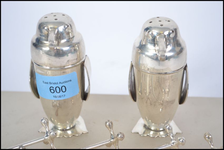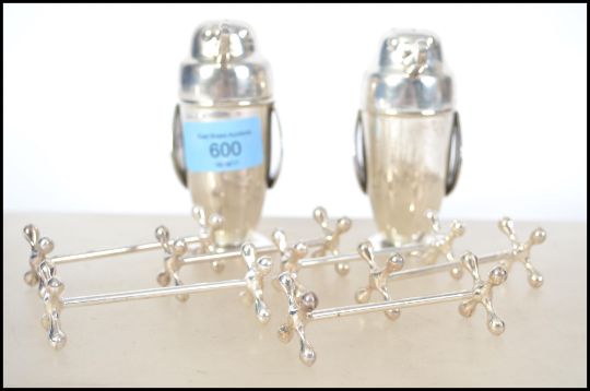 A pair of pepper condiments / pepperettes in the form of penguins with makers marks to the base  together with a set of WMF knife rests