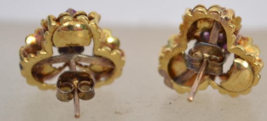 A pair of 18ct gold and pink sapphire adorned ladies earrings in the form of flowers, complete with posts and stud. Total weight 6g