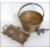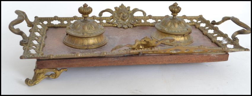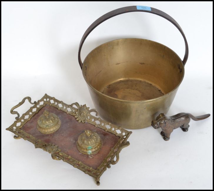 A large copper conserve pot with handle atop along with a 20th century brass twin inkwell and a brass nutcracker in the form of a dog. Largest measures 36cms high.