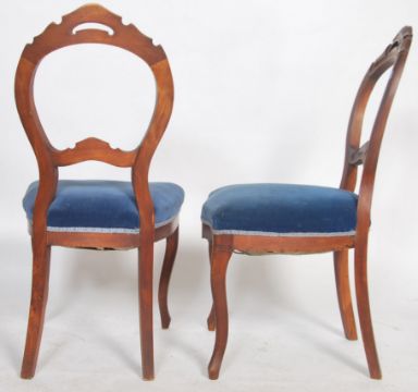 A set of 4 Victorian beech wood balloon back dining chairs raised on serpentine legs with sprung seats having balloon shaped back rests . Measures 93cms x47cms x50cms