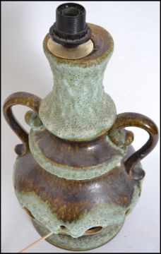 A retro 20th century twin handled West German table lamp of tall form having a speckled glazed with pierced base.