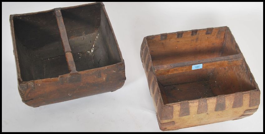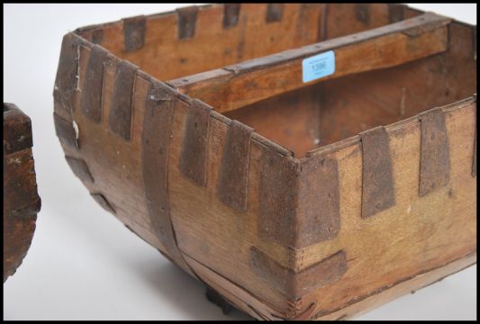 Two vintage 20th century fruit pickers garden trugs of wooden and metal construction with hidden handle to centre. 24cms x35cms x35cms