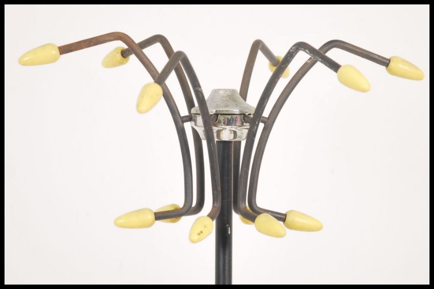 A vintage 20th century Atomic Sputnik style coat stand / umbrella stand of ebonised and chrome form having yellow painted hooks. Measures 60cm high