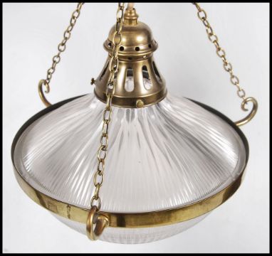 A pair of stunning vintage 20th century glass and brass Empire style ceiling lights, fitted with frosted fitted glass shades complete with original hanging chains. Measures 36cm high x 35cm wide.