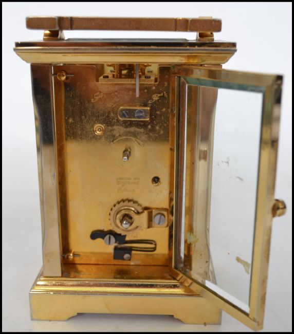 A 20th century brass cased carriage clock by Garrard & Co London W1. Open window escapement with handle atop. Roman numeral chapter ring with faceted hands and notation below. Measures 12cms high.