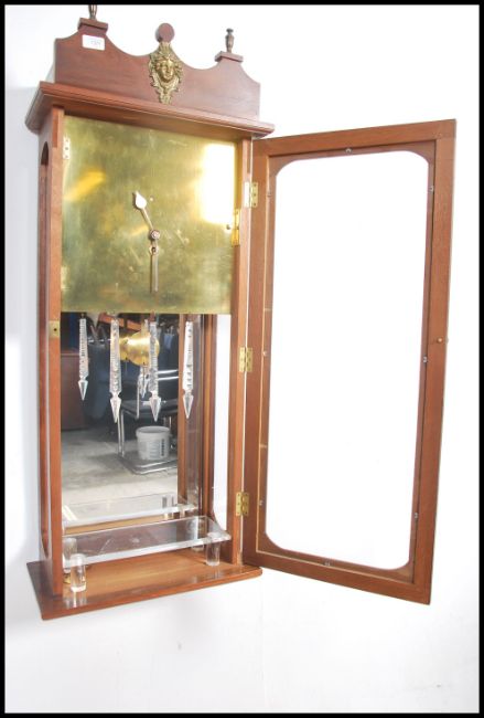 An unusual large wall clock set within a mahogany glazed case having brass blind fronted dial with faceted hands and good fusee movement set to the rear with swing pendulum and keys.  Constructed to a very high standard by the vendor's late father. Measures 112cm high x 46cm wide x 27cm deep.