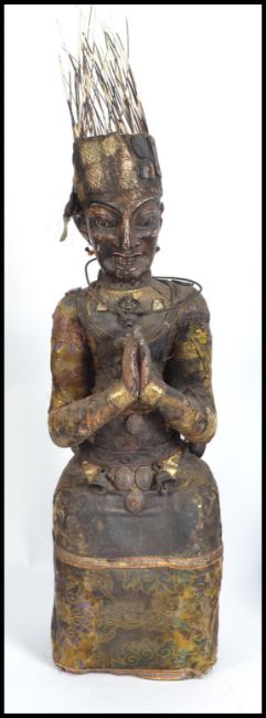 An unusual large believed 19th century tibetan carved hardwood deity with gilded finish having remains of original fabric clothing having porcupine quill head dress
