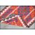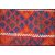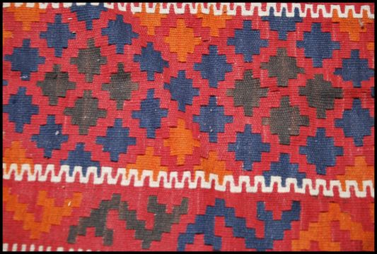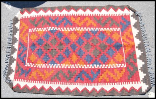 A large and colourful Afghan handwoven  Maimana Kilim rug having red ground with diamond lozenge centre with geometric borders and tassled ends. Measures 140cms x 78cms