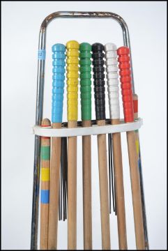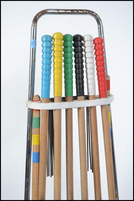 A retro 1980's children's croquet lawn set complete with balls, within the original wheeled carrying holdall / trolley. Measures 93cms high.