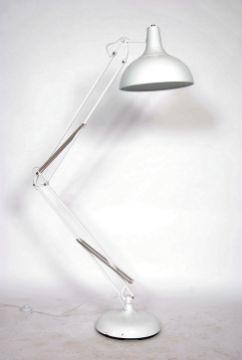 A large floorstanding anglepoise lamp in the manner of Herbert Terry in white having large UFO style pendant shade and terraced base
