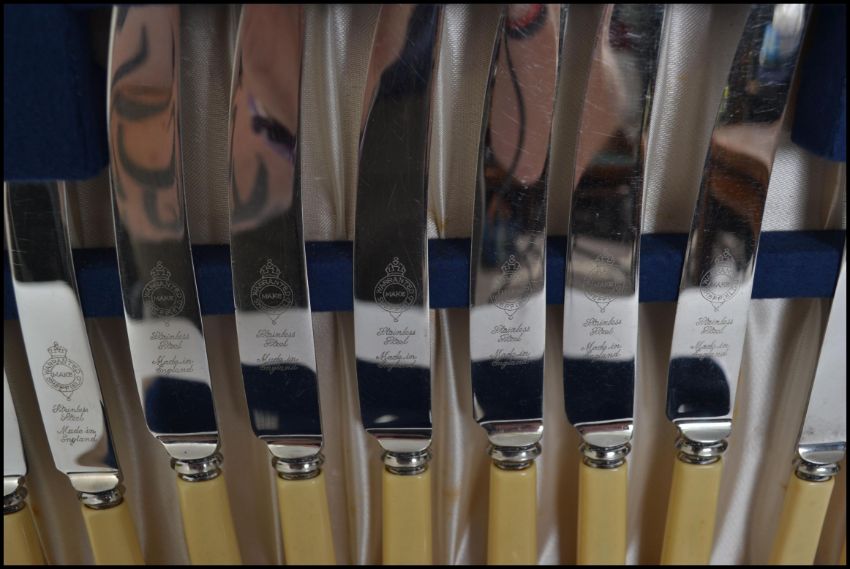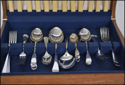 A good 20th century Bilchrome oak cased canteen of cutlery having a blue velvet fitted interior complete with knives, forks, spoons etc