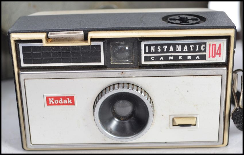 A collection of vintage cameras to include a Zenit E SLR camera, boxed brownies, Ensign and others etc. Measures 15cms wide.