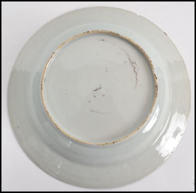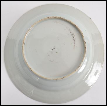 A believed 18th century Oriental blue and white ceramic bowl, with red and gilt detailing depicting birds and flowers. Measures 23cms wide.