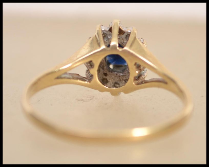 A hallmarked 9ct carat gold sapphire and diamond ring with central illusion set diamond surrounded by a halo of sapphires. Size L