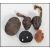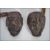 A pair of bronze tragedy and comedy masks along with an Oriental carved frog raised on a wooden plinth base and an Egyptian stone carved scarab beetle.
