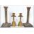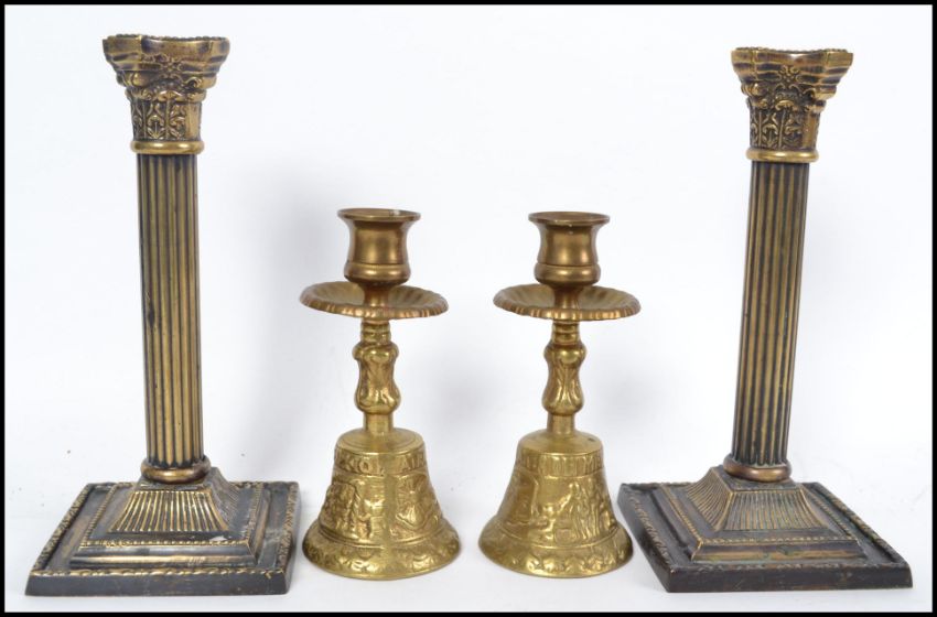 A pair of brass candlesticks in the neo classical style together with a pair of gilt metal bell candlesticks