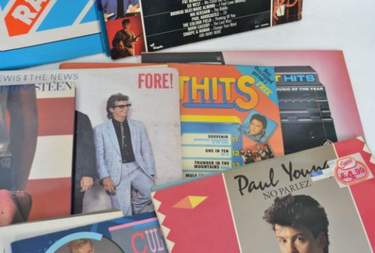 A collection of long play records to include various artists such as ELO on green vinyl, Bee Gees, Ohio Players, Springsteen, Tom Jones, Edwin Starr, Elvis, Wet Wet Wet, Bros, Paul Young, Cultuure Club, Tears For Fears, Rick Astley, Spandau Ballet, Dire Straits and many more.