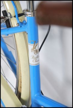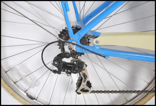 A Pendleton Somerby Womens Hybrid Bike in the manner of vintage beech cruiser style bike having 7 speed Shimano gears, mudguards, a Rack and a chainguard, leather saddle and grips. Measures 18"