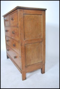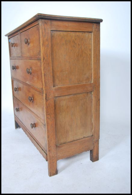 An early 20th century Arts & Crafts Cotswold type solid oak chest of drawers being raised on squared legs with 2 short drawers over 3 deep drawers having flared top above. Knob handles to the drawers