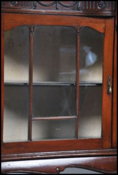 An Edwardian mahogany chiffonier display cabinet raised on shaped legs with glass display cabinet with an open tier shelf  beneath. Measures 107cm high x 121cm wide x 38cm deep