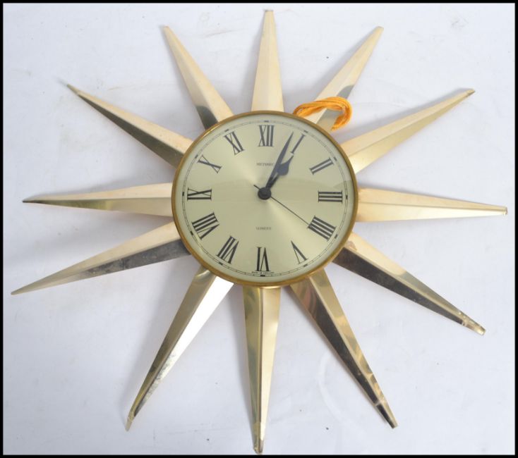 A retro 20th century Metamec sunburst / starburst wall clock in chrome along with another Metamec clock having a fret pierced leaf edge.