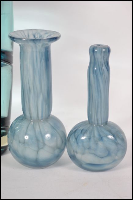 A pair of retro 20th century bases of graduating size, the glass of a morning blue ground with a spiral effect together with two small control bubble vases. Tallest measures 37cms high.