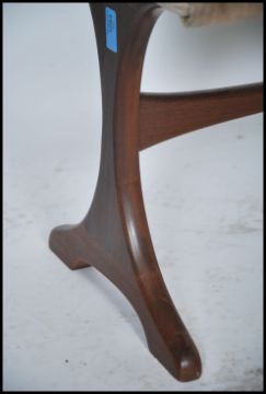 A 1970's retro G-Plan teak wood dressing table stool being raised on angular supports united by stretcher having rectangular upholstered top above