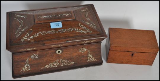 A 19th century Georgian rosewood and mother of pearl inlaid tea caddy having appointed interior within sarcophagus shaped body Together with a later Victorian mahogany cased tea caddy of small form