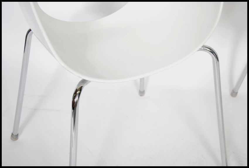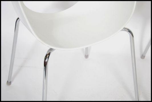 A pair of Italian designer Sintesi " Orbit " dinning chairs raised on chrome supports, stamped to base Made In Italy. Measures 80cm high x 53cm wide