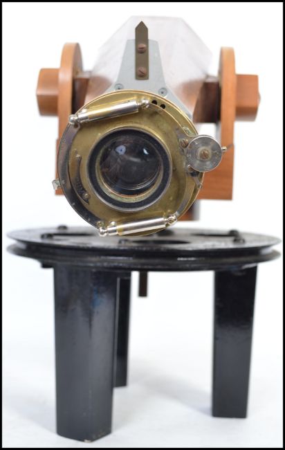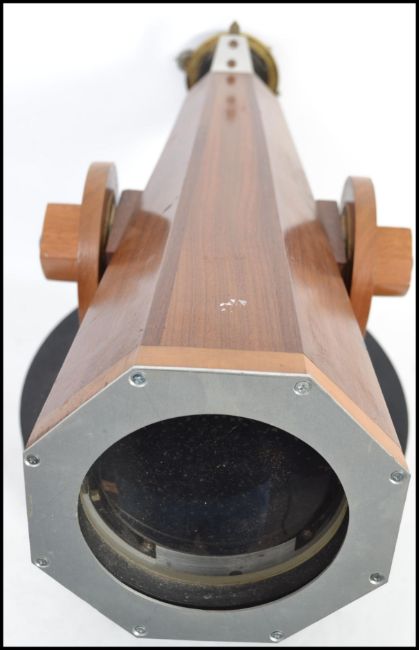 An unusual octagonal wood cased telescope mounted on a heavy metal swivel stand. The telescope with a 12cms diameter lens to one end and a late 19th century Unicum lens to the other. Measures 60cms long.