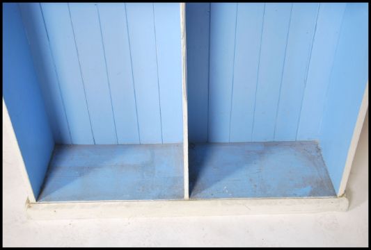 A 20th century painted shabby chic two tone school cupboard open window bookcase cabinet being raised on plinth base with 4 shelves under flared cornice