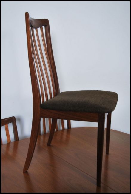 A 20th century G-Plan teak wood dining table and chairs of good quality. The extending table raised on turned legs with railed back dining chairs with pad seats