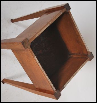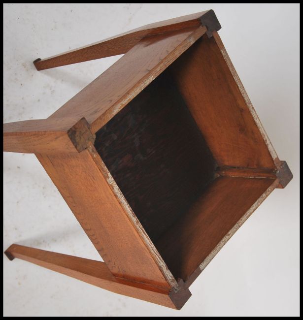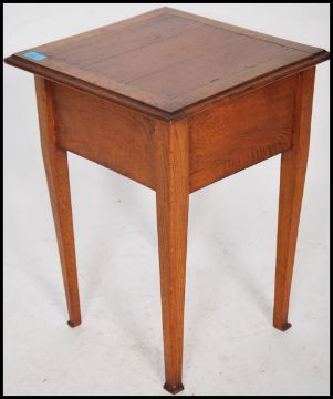 An early 20th century golden oak pedestal sewing box being raised on square tapered legs with flared lift off top