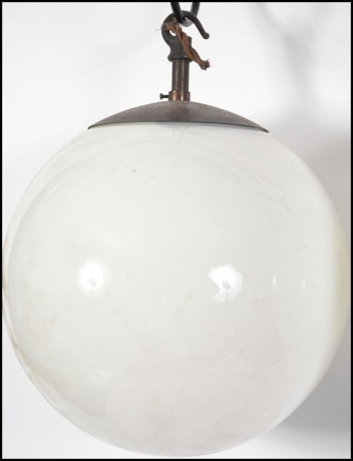 A set of 3 mid century milk glass globe lights - shades, each with the original copper mounts and hooks. Each shade of spherical white glass form