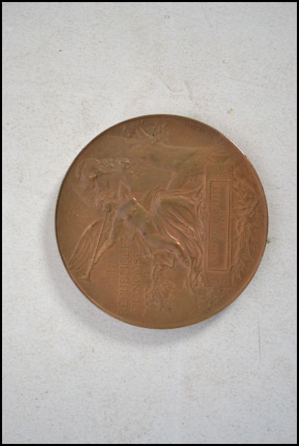 A 19th century French bronze medallion plaque for the Exhibition Universal 1889 along with another commemorative medal.