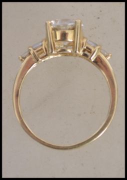 A hallmarked 9ct gold ring set with a large central round cut CZ with baguette and round cut CZ set shoulders. Hallmarked Birmingham. Weight 3.9g. Size O.