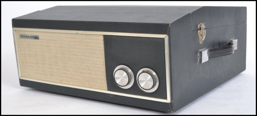 A vintage 1950's two tone portable record player by Marconiphone having dial facia with hinged top, all in blue and cream