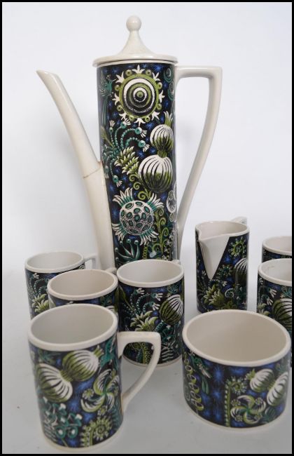 A retro 20th century  Portmeirion ' Magic Garden ' coffee service comprising tall coffee pot together with cans and saucers. Marked to the base.  Measures 34cms high.