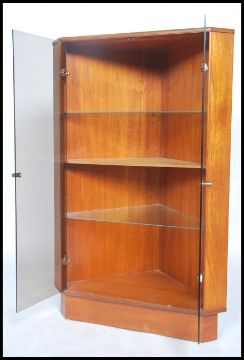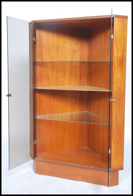 A retro 1970's teak wood corner cabinet having shelved interior with smoked glass panel door