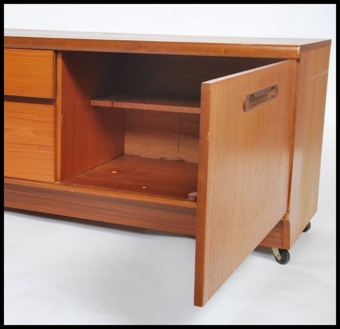 A 1970's teak wood low dresser base sideboard by Portwood being raised on inset plinth base comprising a series of drawers and cupboards.Measures 55cm high x 187cm wide x 46cm deep.