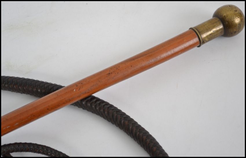 A good believed early 20th century Australian snake whip. The malacca shaft adorned with large leather woven strap whip