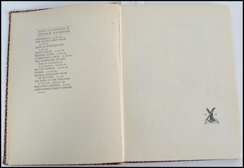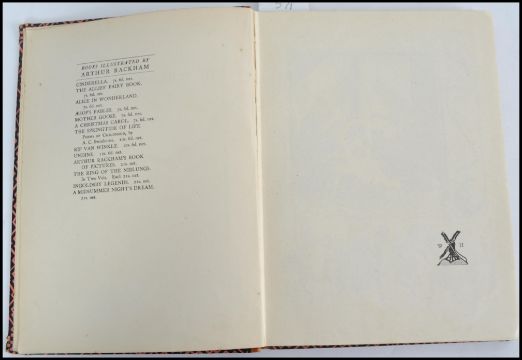 Sleeping Beauty; Arthur Rackham. 1920 First Edition; J.P. Lippincott, Philadelphia and William Heinemann, London. 4to, in the original pictorial paper boards featuring one of Rackham’s silhouette illustrations printed in pink and black, backed in pink cloth lettered in black. Scarce.