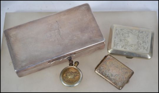 A good quality silver plated table top cigarette case by Aristocrat together with a silver plated pocket cigarette case, silver plated matchbox case and a silver plated lighter with inset coin.