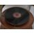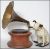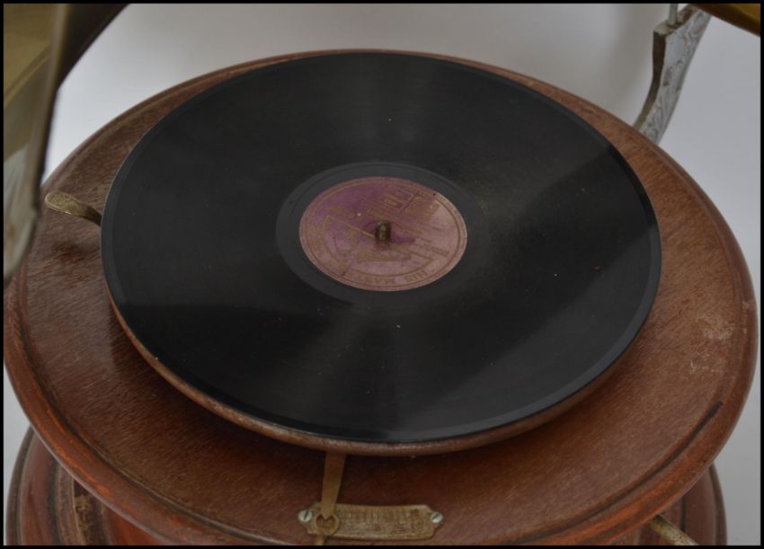 An vintage wooden gramophone with morning glory brass horn, the base of circular form. Complete with a large  composite figurine of His Masters Voice dog nipper.