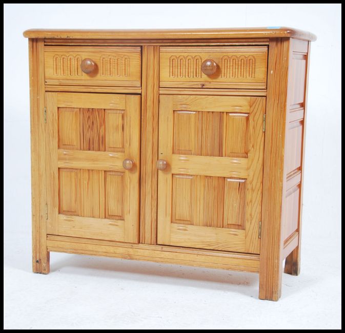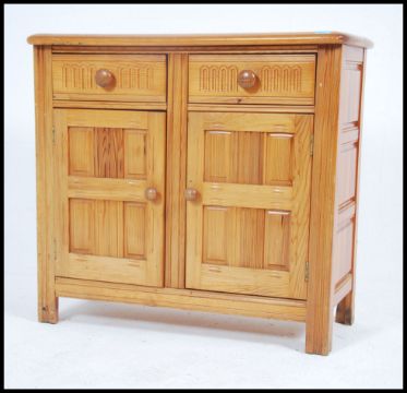 An Ercol style pine dresser base having chamfered edge top over twin drawers and cupboards beneath. Measures 82cm high x 90cm wide x 41cm deep