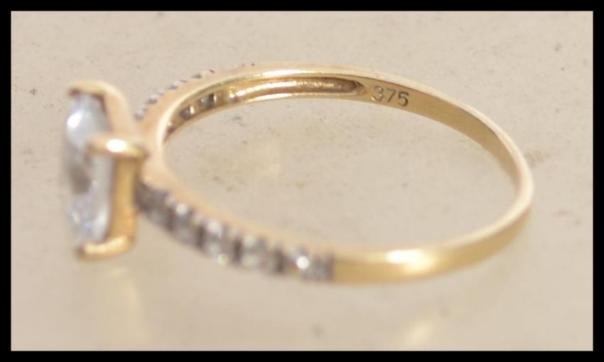 A 9ct gold ring set with a central princess cut CZ with CZ accent shoulders. Marked 375 CZ tests 9ct gold. Size O.