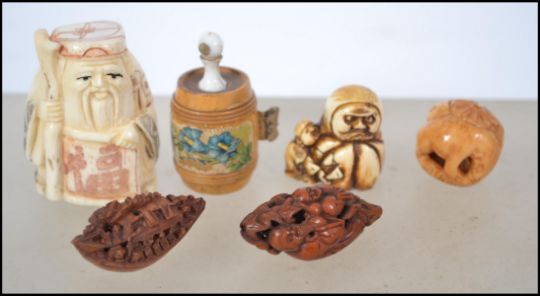 A Chinese bone netsuke figure of an elder with character marks to the base together with resin nut netuske, and faux ivory resin netsuke along with a tape measure wooden barrel Tallest measures 5cms high.