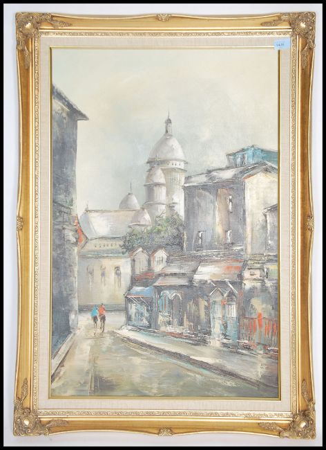 A large gilt framed continental oil on canvas painting of a Parisian street scene study with Figures. Unsigned
